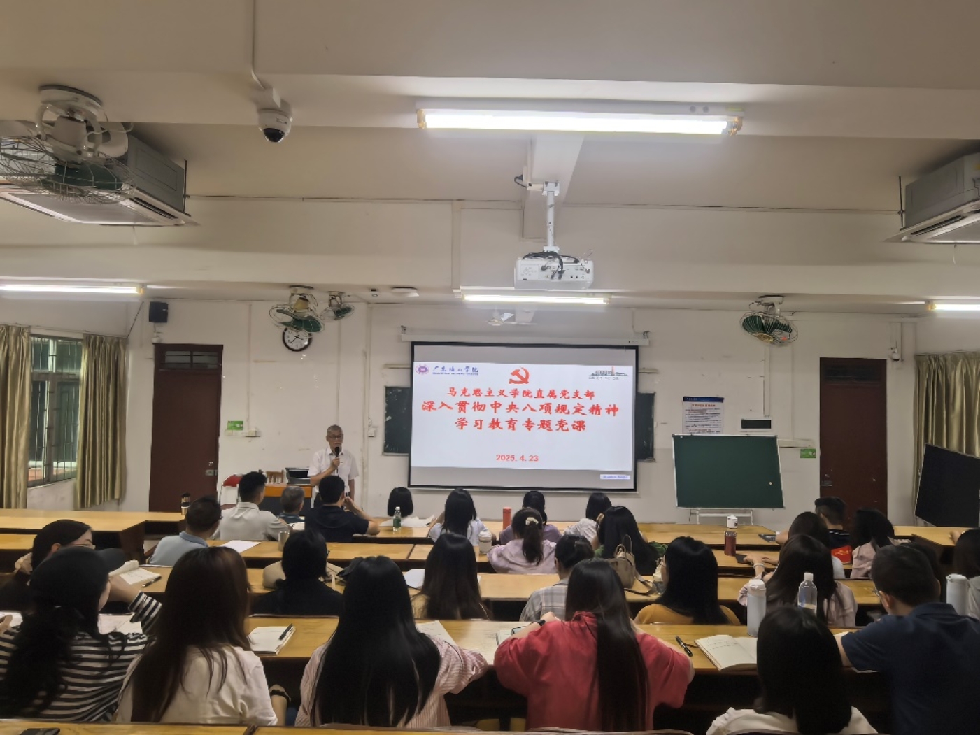 (本网讯 金石榴)为深入贯彻落实党中央和省委教育工委有关深入开展学习贯彻中央八项规定精神工作部署和要求,按照学校党委的实施方案,结合马院实际情况,2025年4月23日下午,我院党支部组织全体党员在2教207课室参加专题党课培训学习,学院直属党支部书记易钢上了题为《锲而不舍贯彻中央八项规定精神 推动党的作风持续向好》的专题党课。党课由支部组织委员金石榴主持,支部全体党员共55人参加学习。